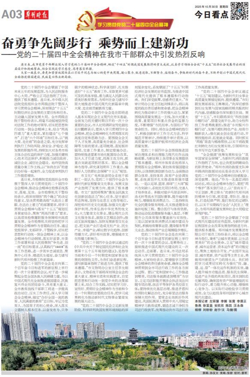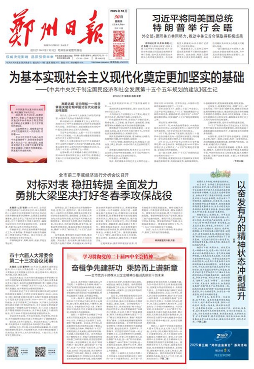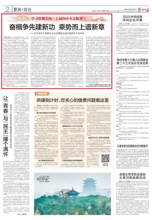 黨的二十屆四中全會擘畫了中國式現(xiàn)代化建設(shè)的宏偉藍(lán)圖,為新時代新征程國有企業(yè)改革發(fā)展指明前進方向、提供根本遵循,鄭州城發(fā)集團廣大黨員干部群眾深受鼓舞、倍感振奮。近日,《鄭州日報》《鄭州晚報》開設(shè)了【學(xué)習(xí)貫徹黨的二十屆四中全會精神】專欄,2025年10月30日,報道了鄭州城發(fā)集團深入學(xué)習(xí)貫徹落實黨的二十屆四中全會精神,以全會精神為指引真抓實干創(chuàng)未來。